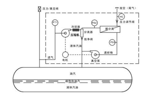 當(dāng)三次油氣回收系統(tǒng)檢測到油罐內(nèi)壓力達(dá)到預(yù)設(shè)的啟動壓力(如+150Pa)時,系統(tǒng)開始工作;壓縮機從油罐中抽取油氣并進行壓縮,升高溫度的油氣通過冷凝裝置進行常溫冷卻,部分油氣被直接冷凝為液態(tài)油;剩下的油氣/空氣混合物繼續(xù)進入具有選擇滲透功能的膜組件進行分離,混和氣被分為富含油氣的滲透相—超飽和油氣和凈化了的空氣,超飽和油氣通過真空泵抽回油罐,凈化空氣則可以直接排放到大氣中。隨著油氣回收系統(tǒng)的運行,油罐上方的壓力會逐漸下降,當(dāng)油罐頂部的壓力下降到低于停止壓力(如-150Pa)或設(shè)備停止時間時,系統(tǒng)會自動停止直至油罐頂部壓力再次升高達(dá)到設(shè)定啟動壓力時,設(shè)備再次啟動。